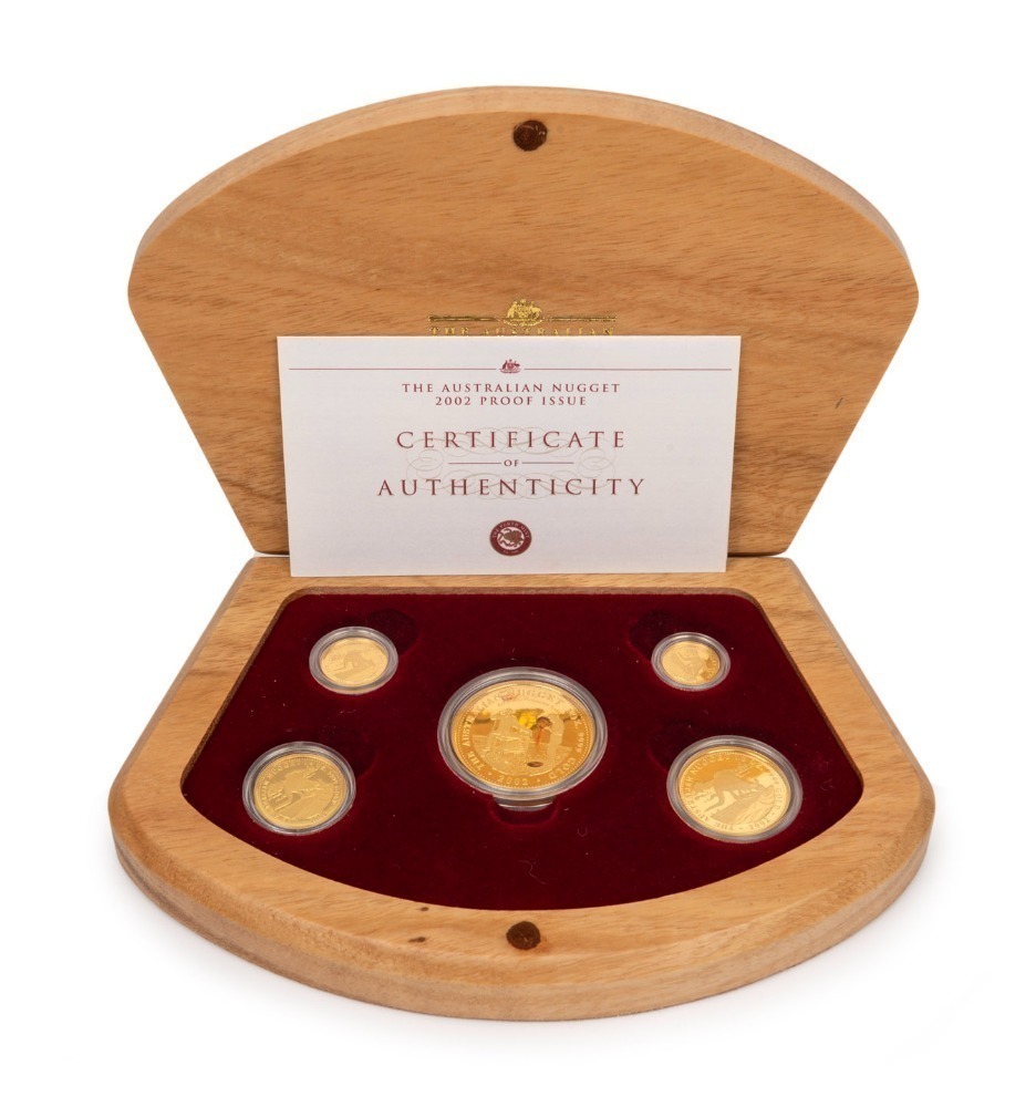 THE AUSTRALIAN NUGGET 2002 PROOF SET OF FIVE COINS featuring the $100 (1oz) "Dry Blowing Prospector", plus $50, $25, $15 and $5 Kangaroos, all attractively presented in the original timber case of