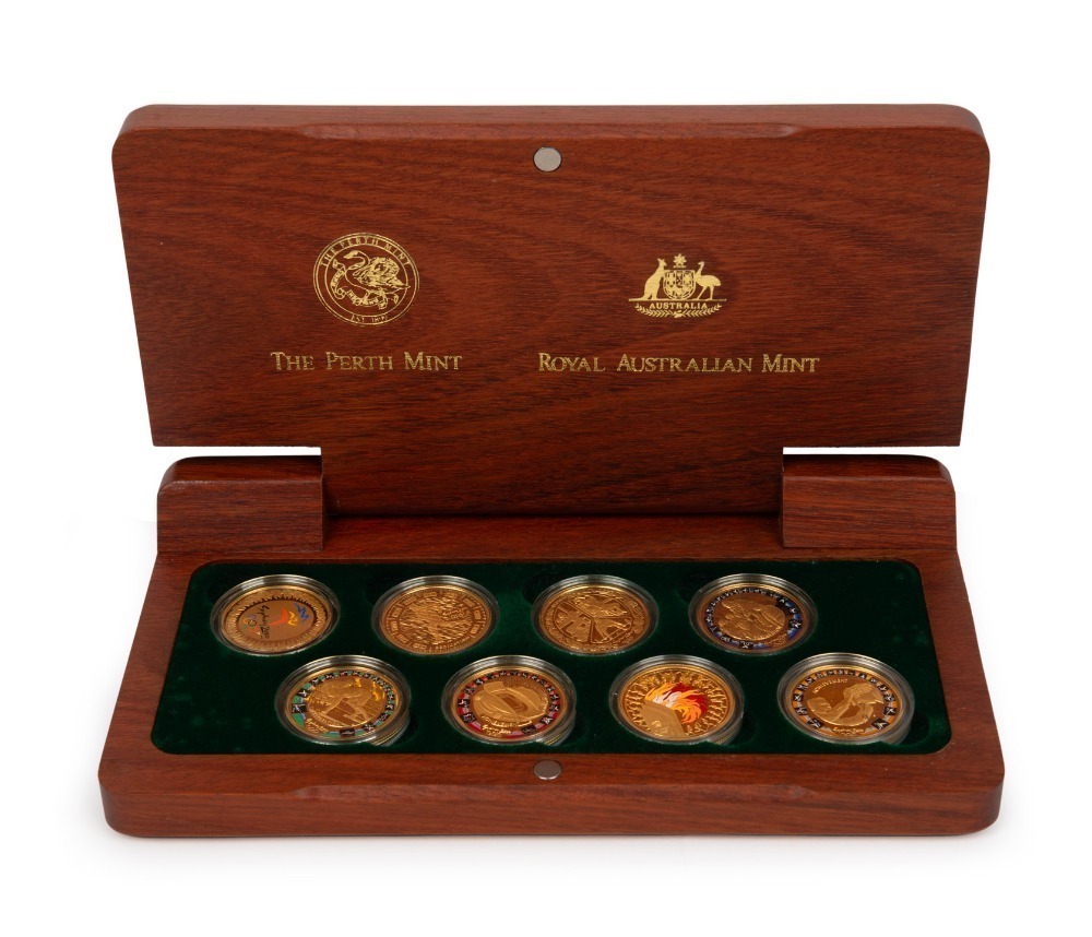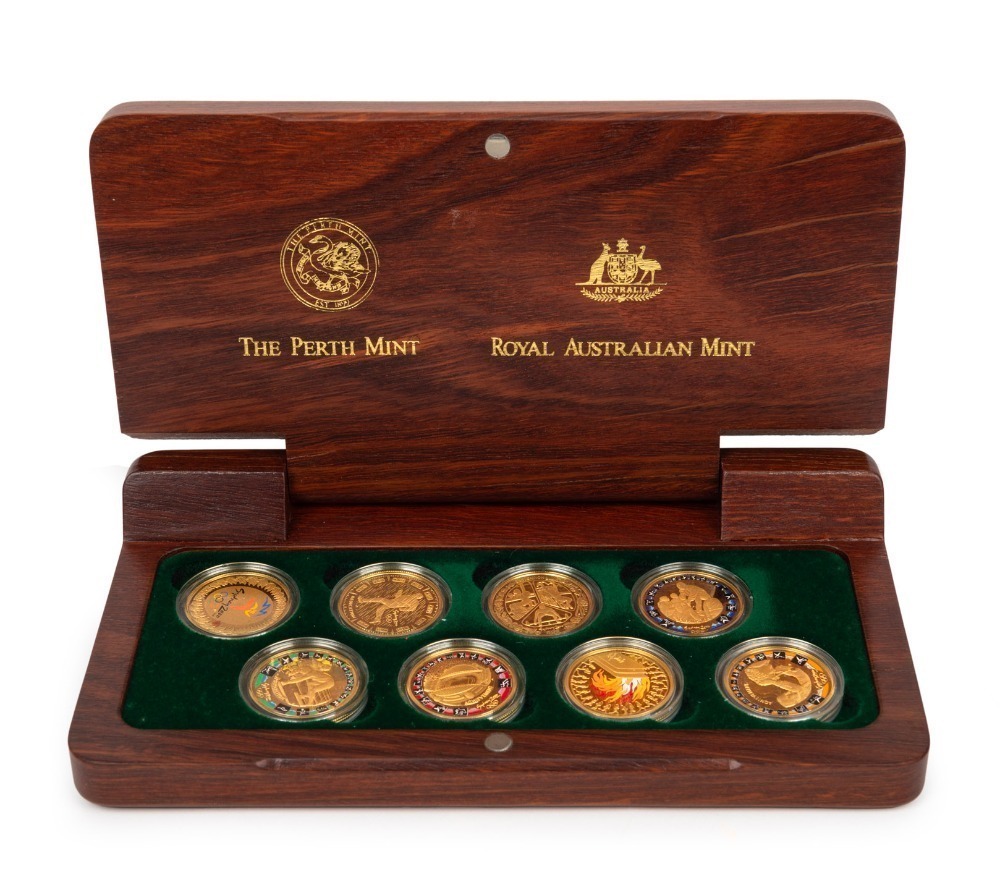 SYDNEY 2000 $100 GOLD PROOF COIN COLLECTION, comprising of eight different designs, presented in the original jarrah timber case, and accompanied by 8 Certificates of Authenticity identifying the coins as