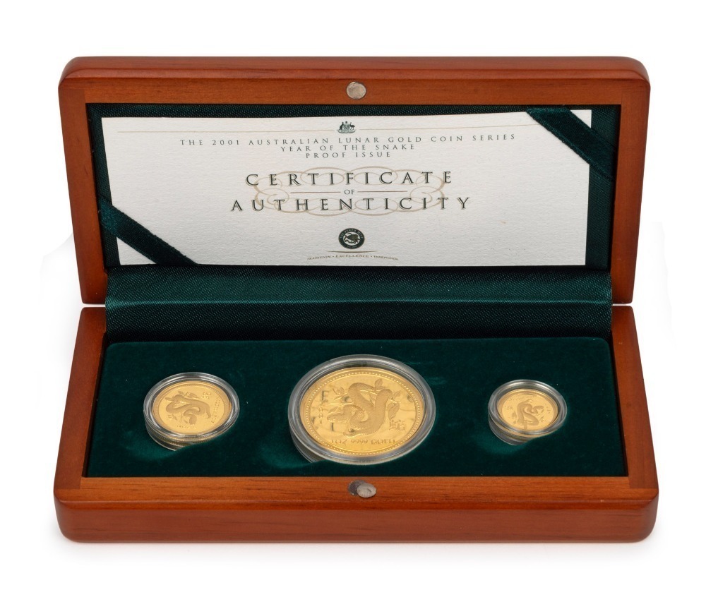 2001 YEAR OF THE SNAKE: AUSTRALIAN LUNAR GOLD BULLION COIN PROOF SERIES of three coins, comprising of the $100 (1oz), the $25 and the $15, all depicting a snake; in the original silk-lined timber case of issue