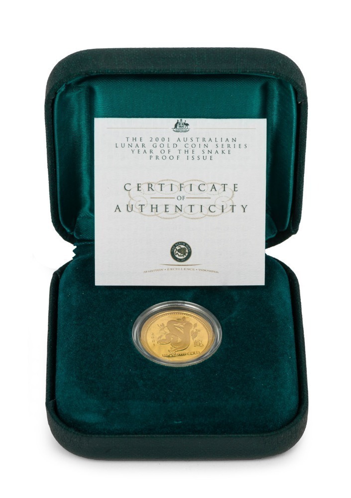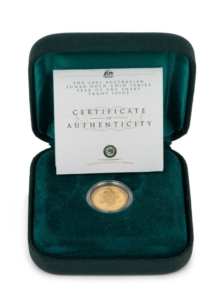 2001 YEAR OF THE SNAKE: AUSTRALIAN LUNAR GOLD BULLION COIN PROOF $25 (1/4oz) in the original silk-lined case of issue and accompanied by a Certificate of Authenticity indicating that this is coin No.3940.