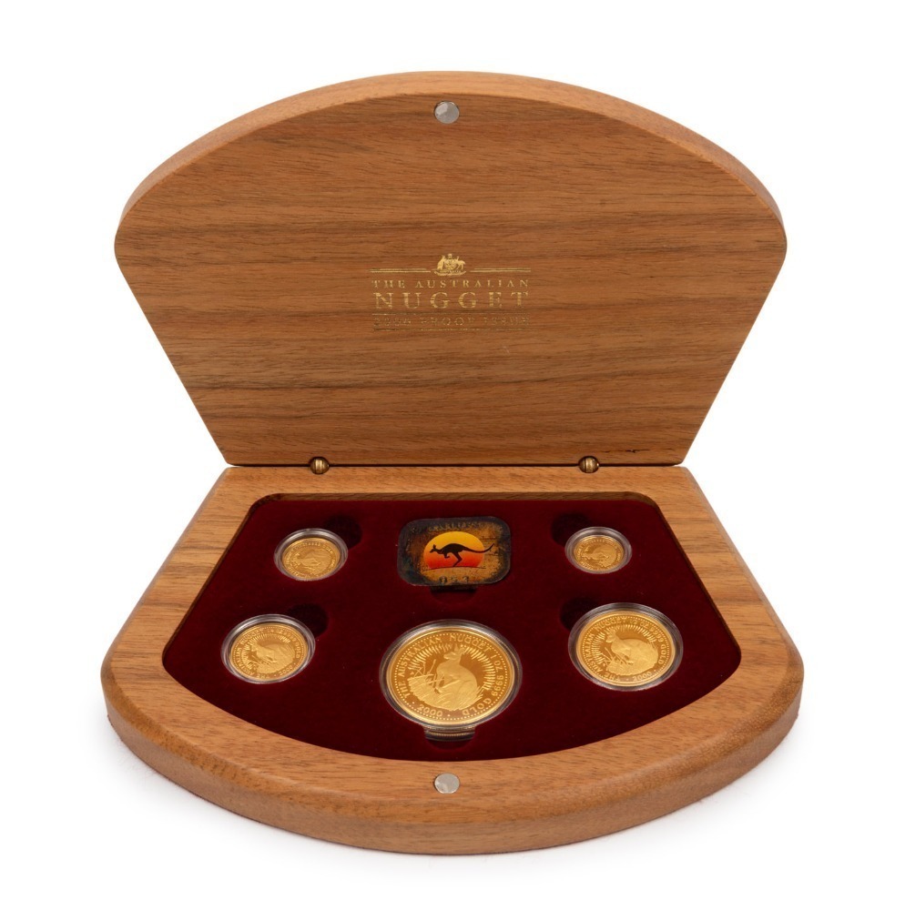 THE AUSTRALIAN NUGGET 2001 PROOF SET OF FIVE COINS featuring the $100 (1oz) "Gold Rush, Prospector panning", plus $50, $25, $15 and $5 Kangaroos, all attractively presented in the original timber case