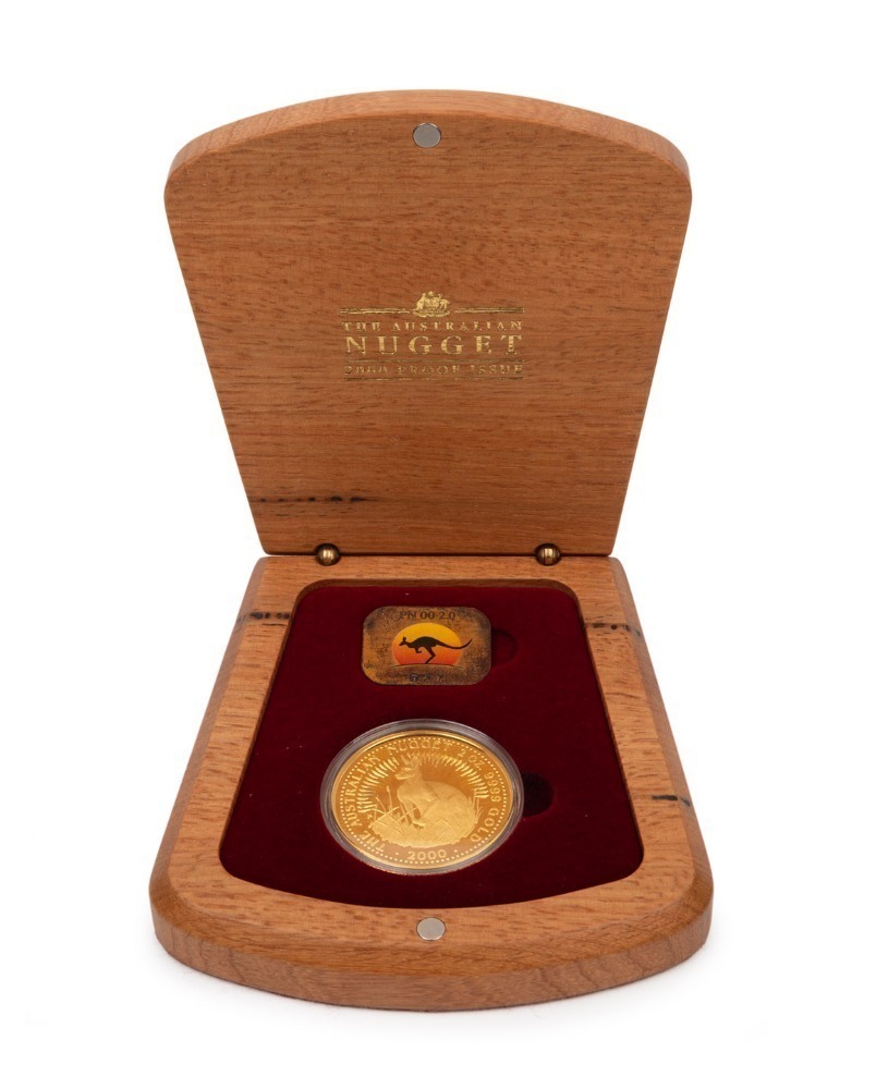 THE AUSTRALIAN NUGGET 2000 PROOF "KANGAROO" $200 (2oz) coin, attractively presented in the original timber case of issue and packaging; accompanied by a plaque which identifies this as coin No.027 of