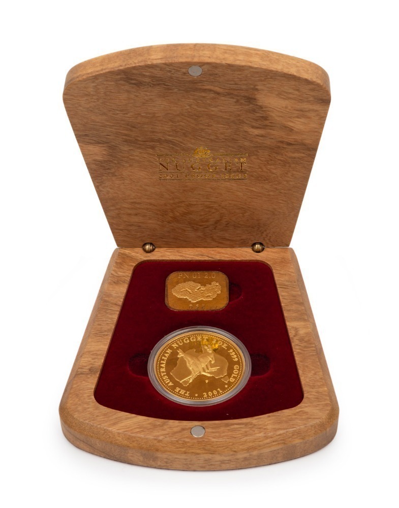THE AUSTRALIAN NUGGET 2001 PROOF "KANGAROO" $200 (2oz) coin, attractively presented in the original timber case of issue and packaging; accompanied by a plaque which identifies this as coin No.062 of