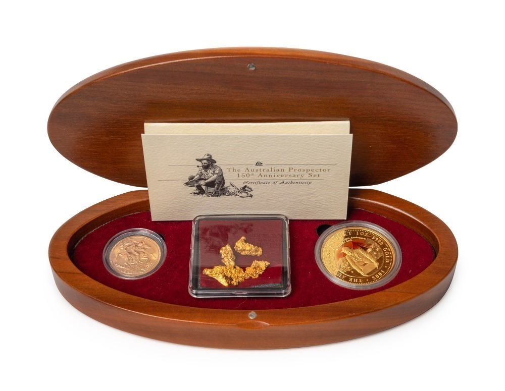 grams. All presented in an oval-shaped timber case featuring a prospector with his dry blowing equipment and accompanied by a Certificate of Authenticity numbered 051 of only 250 produced.