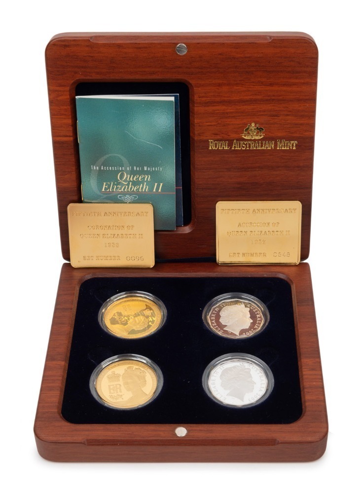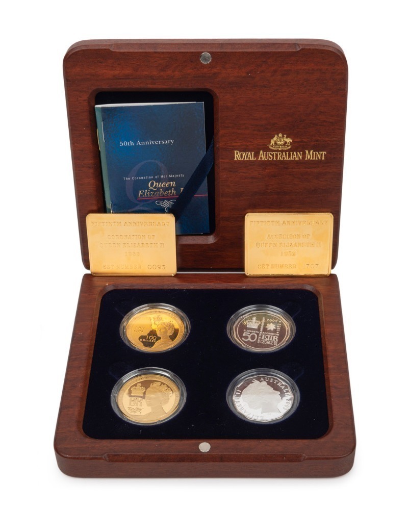 Proof (numbered set 0648 of the 2002 produced); together with the 2003 $100 (1oz) pure gold 50th Anniversary of the Coronation, together with the silver 50c Coronation Proof (numbered set 0096 of the 2--3 produced). The four Proof coins, together