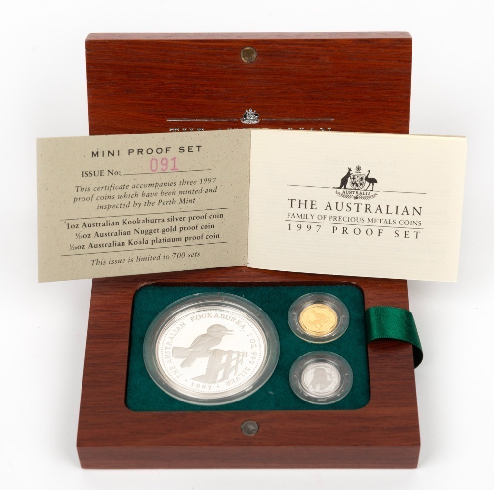 THE 1997 AUSTRALIAN FAMILY OF PRECIOUS METALS SET OF MINI PROOF COINS: comprising of a $1 (1oz) Australian Kookaburra silver Proof, a $5 (1/20oz) pure gold Australian Nugget Proof, and a $5 (1/20oz) platinum