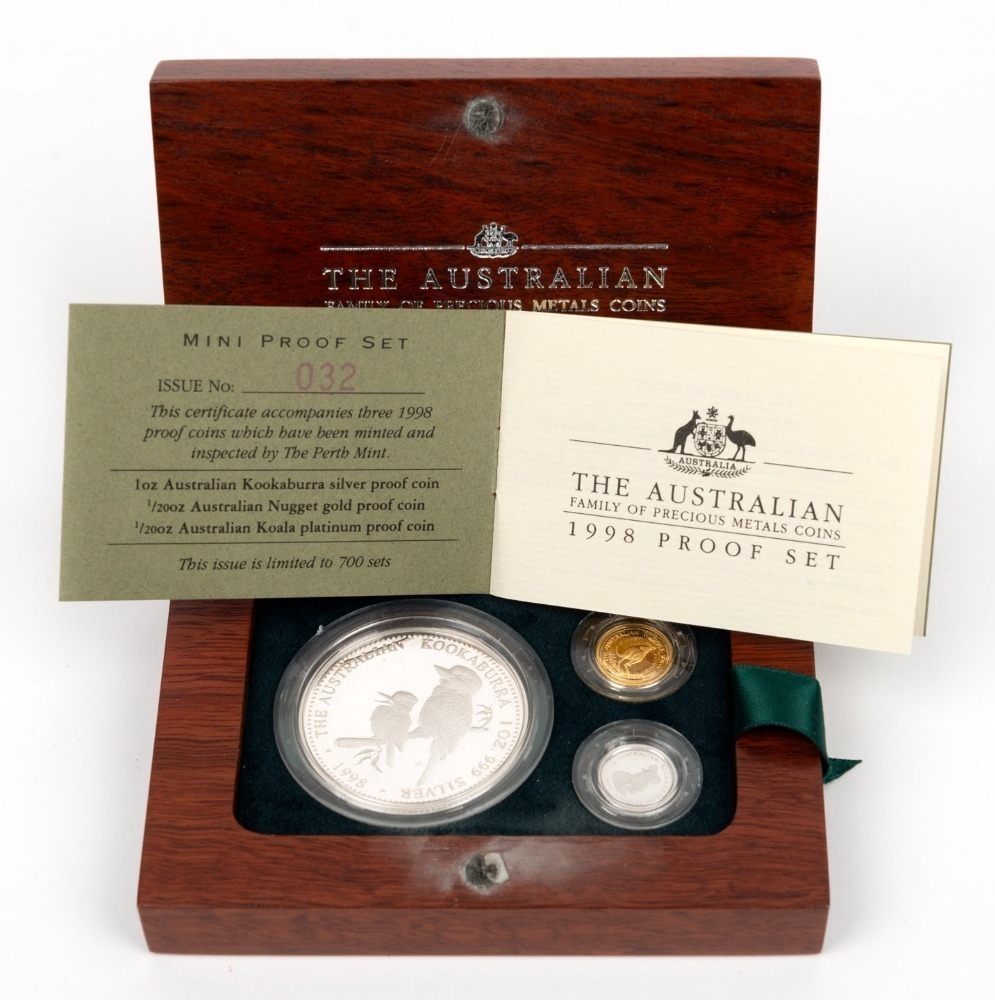 THE 1998 AUSTRALIAN FAMILY OF PRECIOUS METALS SET OF MINI PROOF COINS: comprising of a $1 (1oz) Australian Kookaburra silver Proof, a $5 (1/20oz) pure gold Australian Nugget Proof, and a $5 (1/20oz) platinum