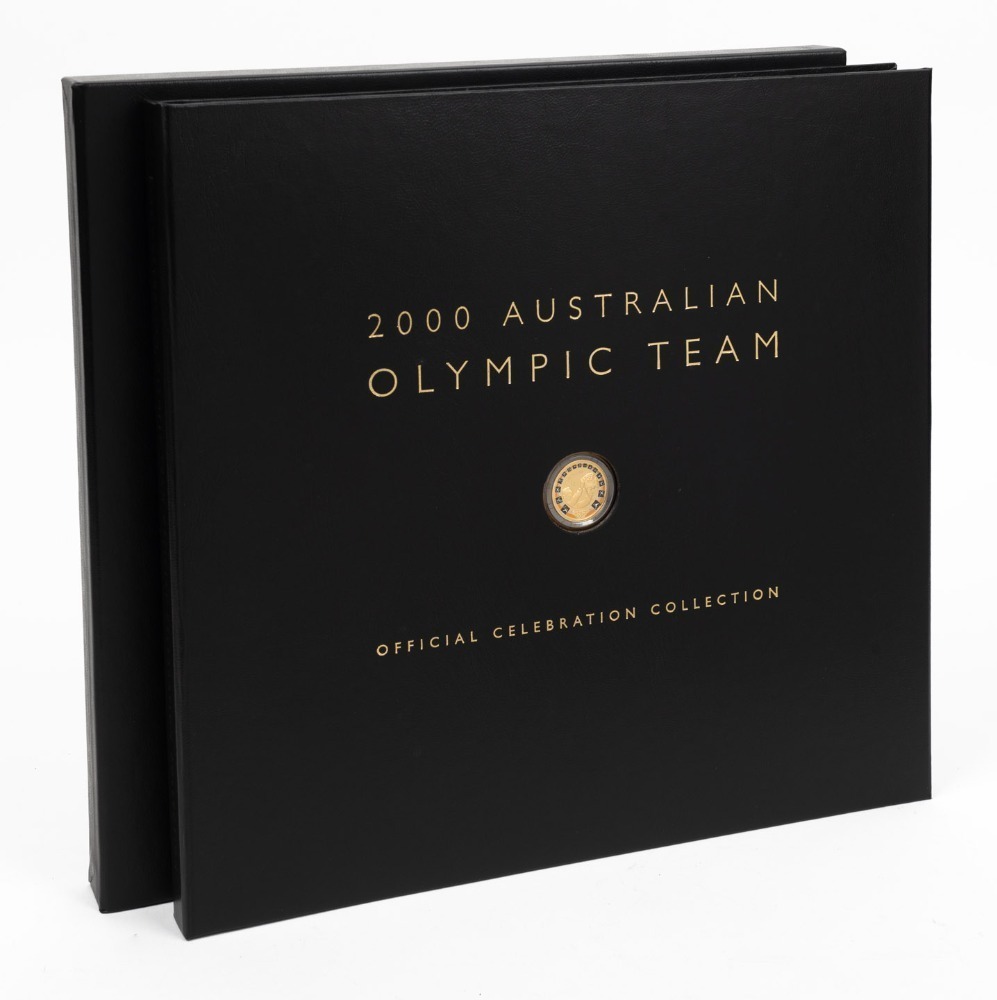 2000 Australian Olympic Team Official Celebration Collection large format book, with a $100 GOLD proof "Achievement" and 10 x $5 bronze "Gold Medal Sports" coins. Issued by the Perth Mint .
