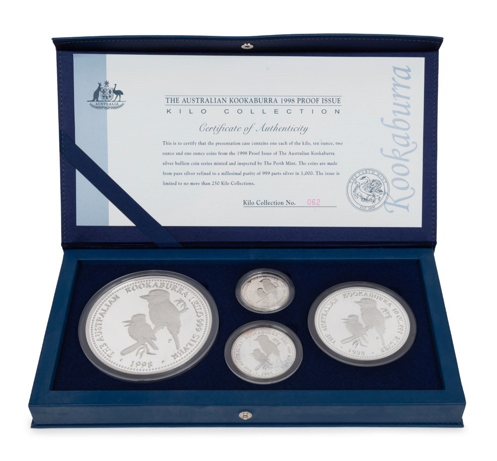 The Australian Kookaburra 1998 Proof Issue - KILO COLLECTION in presentation case containing one of each of the kilo, ten ounce, two ounce and one ounce coins produced by The Perth Mint. With Certificate of
