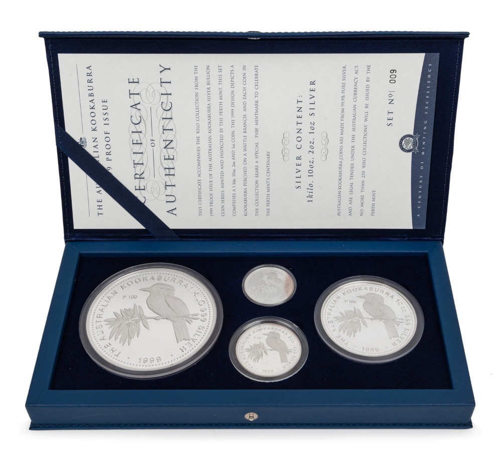 The Australian Kookaburra 1999 Proof Issue - KILO COLLECTION in presentation case containing one of each of the kilo, ten ounce, two ounce and one ounce coins produced by The Perth Mint. With Certificate of