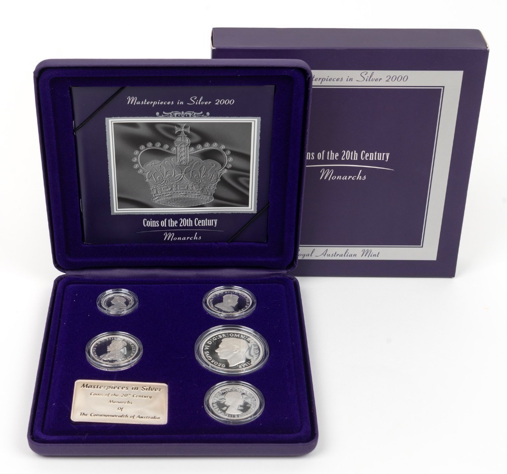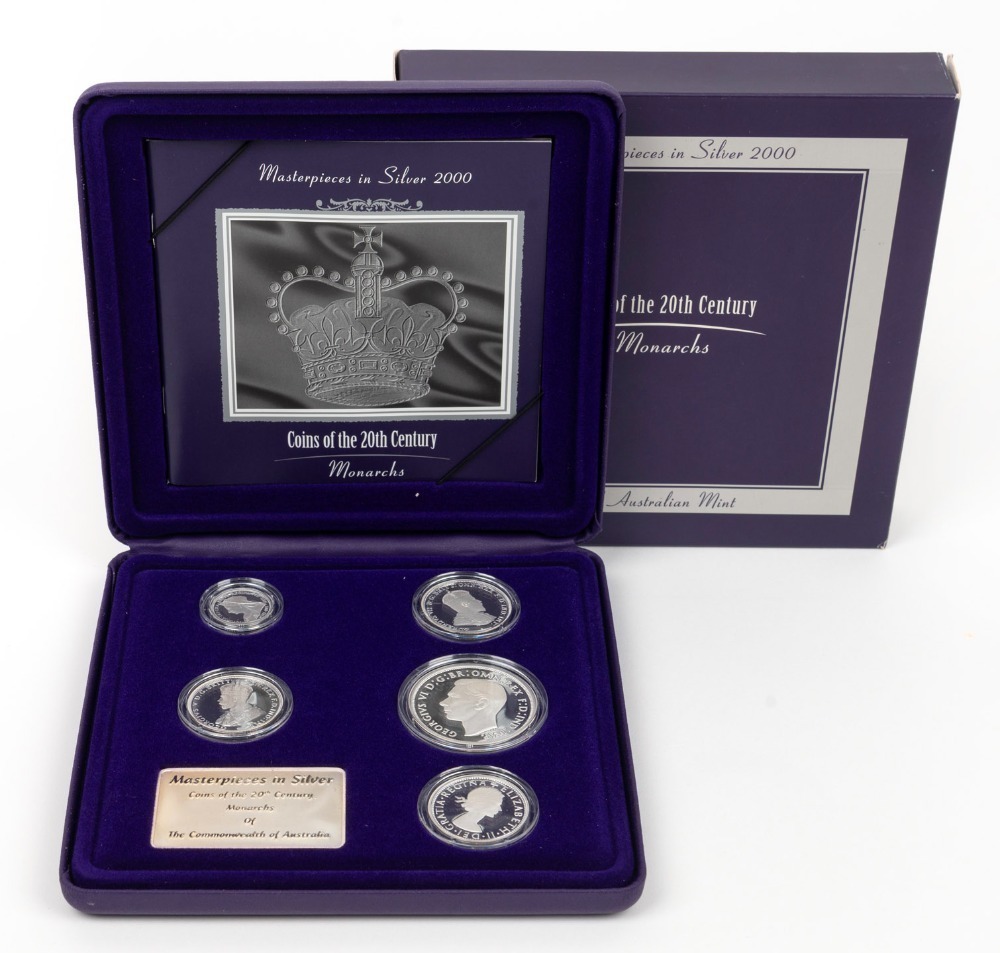 Masterpieces in Silver - Coins of the 20th Century - 2000 Monarchs silver proof set of 5 coins + silver plaque; set No.1876 of 15,000 in original presentation case and box with certificate.
