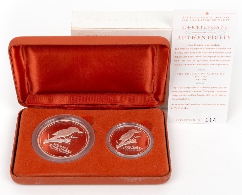 The Australian Kookaburra 2002 Proof Issue - TWO OUNCE COLLECTION in presentation case containing one of each of the two ounce and one ounce proof coins produced by The Perth Mint. With Certificate of