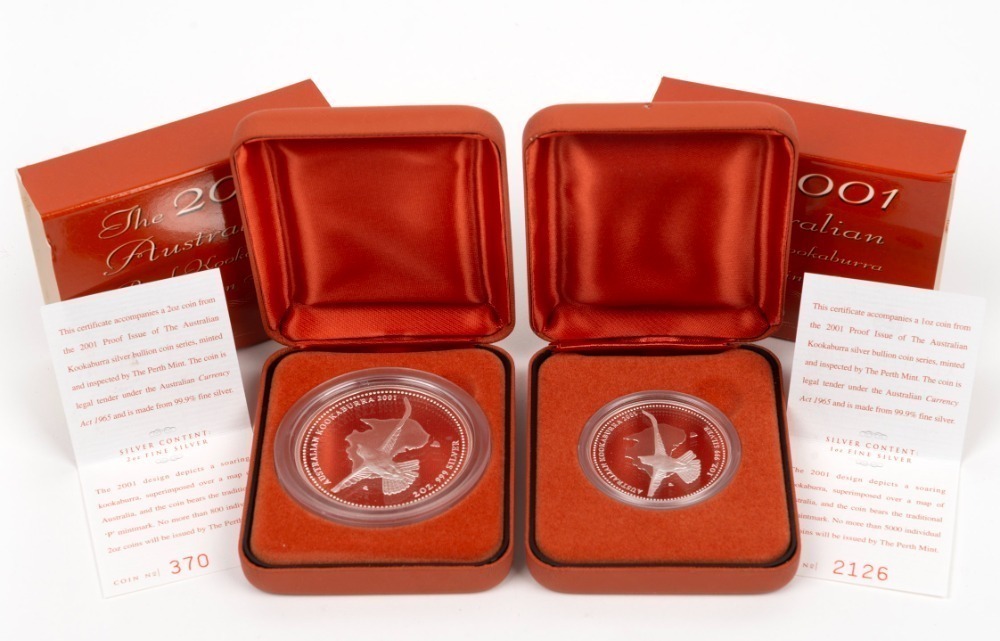The Australian Kookaburra 2001 Proof Issue - TWO OUNCE and ONE OUNCE coins, each in their individual presentation case produced by The Perth Mint. With individual Certificates of Authenticity. (2 items).