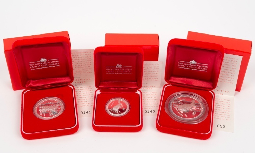 1999 YEAR OF THE RABBIT: AUSTRALIAN LUNAR SILVER COIN PROOF SERIES of three coins, comprising of the $2 (2oz), the $1 (1oz) and the 50c (½oz), all depicting a rabbit; each in their original felt-lined