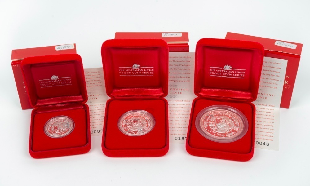 2000 YEAR OF THE DRAGON: AUSTRALIAN LUNAR SILVER COIN PROOF SERIES of three coins, comprising of the $2 (2oz), the $1 (1oz) and the 50c (½oz), all depicting a dragon gazing at a pearl; each in their