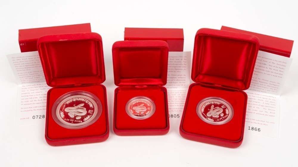 2001 YEAR OF THE SNAKE: AUSTRALIAN LUNAR SILVER COIN PROOF SERIES of three coins, comprising of the $2 (2oz), the $1 (1oz) and the 50c (½oz), all depicting a snake; each in their original felt-lined red