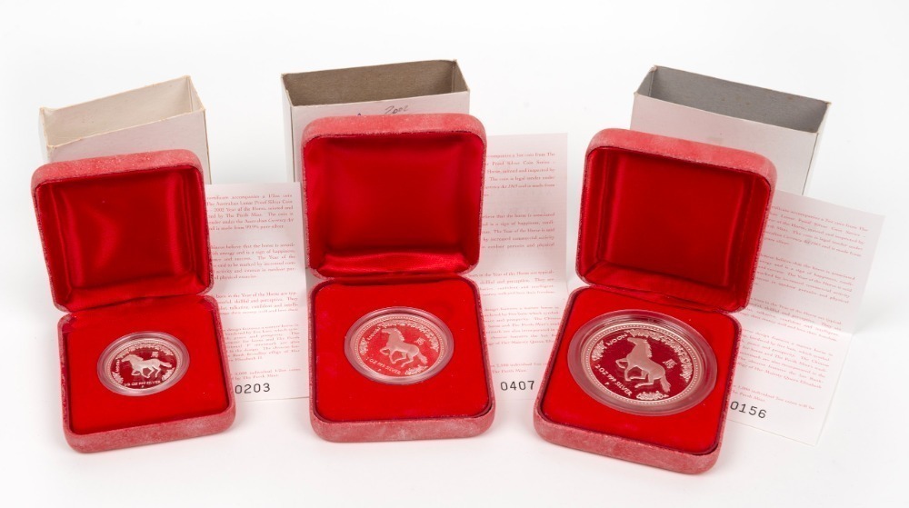 2002 YEAR OF THE RABBIT: AUSTRALIAN LUNAR SILVER COIN PROOF SERIES of three coins, comprising of the $2 (2oz), the $1 (1oz) and the 50c (½oz), all depicting a galloping horse; each in their original