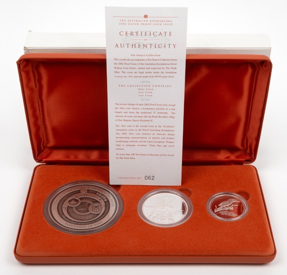 The Australian Kookaburra 2002 Proof Issue - TEN OUNCE COLLECTION in presentation case containing one of each of the ten ounce, two ounce and one ounce proof coins produced by The Perth Mint. With Certificate