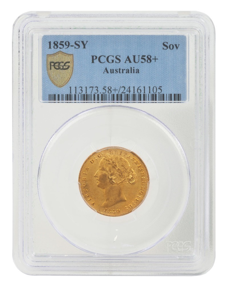 1859 Sydney Mint Sovereign, Type II, PCGS AU58+.