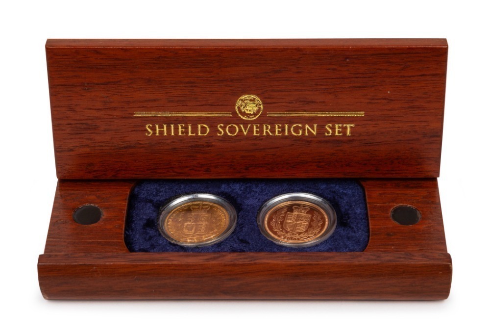 A SHIELD SOVEREIGN SET from The Perth Mint: A small timber case containing an 1884S Victoria Young Head sovereign with Shield back, aUnc; together with an English 2002 Proof Sovereign with Shield back.