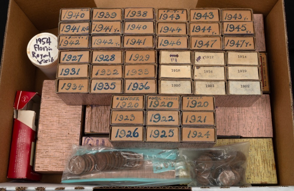 HALF-PENNIES & PENNIES: An unknown quantity in unknown condition, all contained in labelled matchboxes with all the coins wrapped in tissues; also a single 1937 Crown, a tube with 13 x 1954 Royal Visit