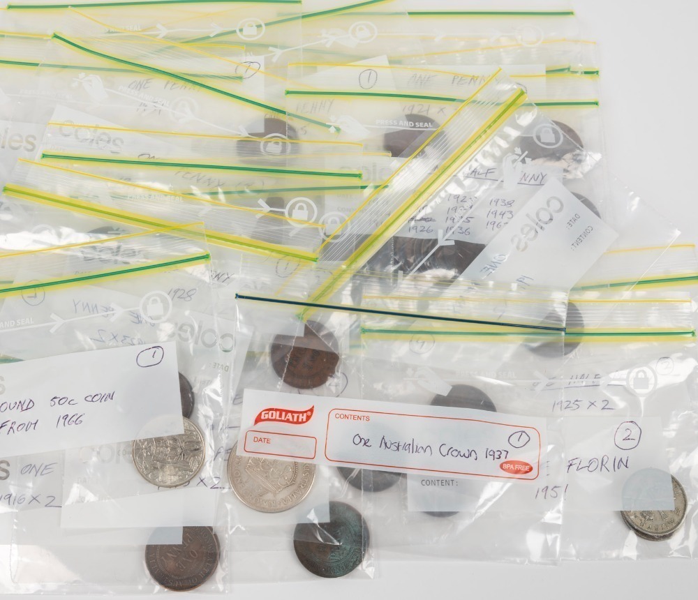 An accumulation of Australian coins in a plastic sorting box; noted 1915 Sovereign (M) with remnants of jewellery mount, a 1937 Crown, 1966 50c (2), a few banknotes and a small number of foreign coins.