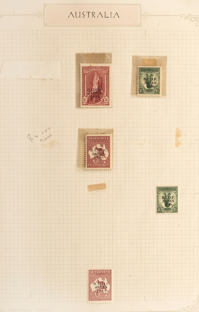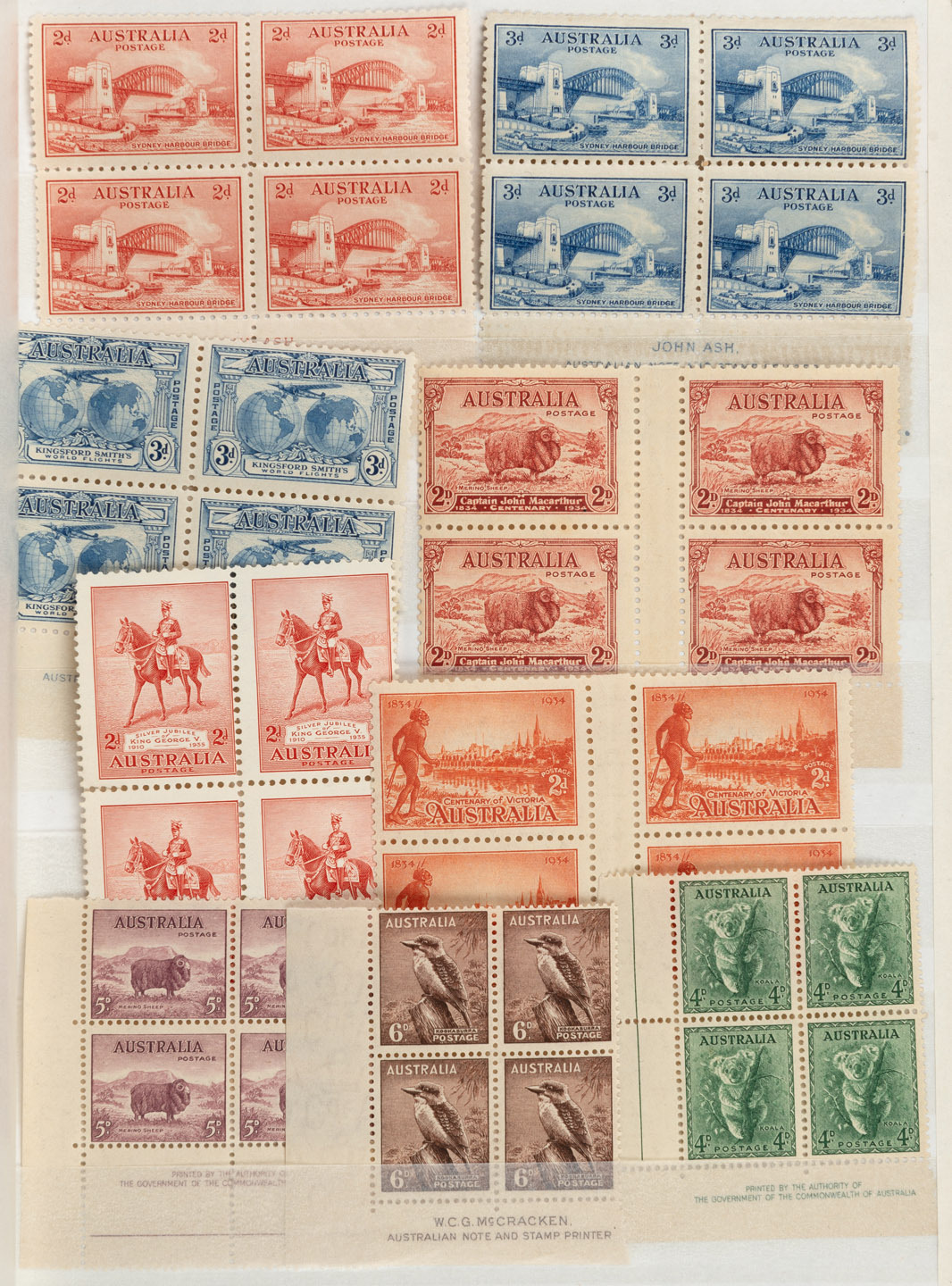 A mainly pre-decimal Australian accumulation in a small album, noted KGV 4d olive Imprint blk.4, 1937 NSW Sesqui set in Imprint blks.4, AIF set in Imprint blks.4, 3d Macarthur Imp.blk.12, 2d & 3d Victoria