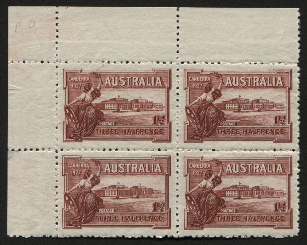1927 (SG.105) 1½d Canberra, upper left corner blk.(4) with part Plate "9" visible in the top margin. BW:132zh - $1250 (if complete); stamps **.
