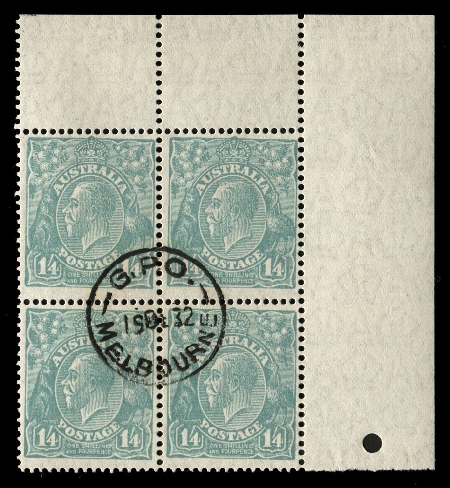 Exhibition; 3d blue marginal blk.4 CTO at the Bridge 22 Mar. 1932; a single 5/- green CTO; and 2d & 3d Overprinted OS blks.4 CTO at GPO MELBOURNE. (Total: 7 blks.4 + single).
