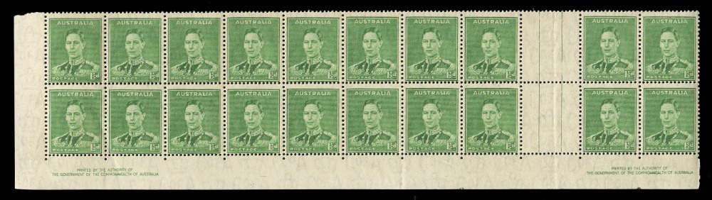1941 (SG.183) KGVI 1½d green, double Authority Imprint blk.(20) incorporating the complete bottom two rows of the left pane and the imprint blk.4 of the right pane; both Imprints with the variety