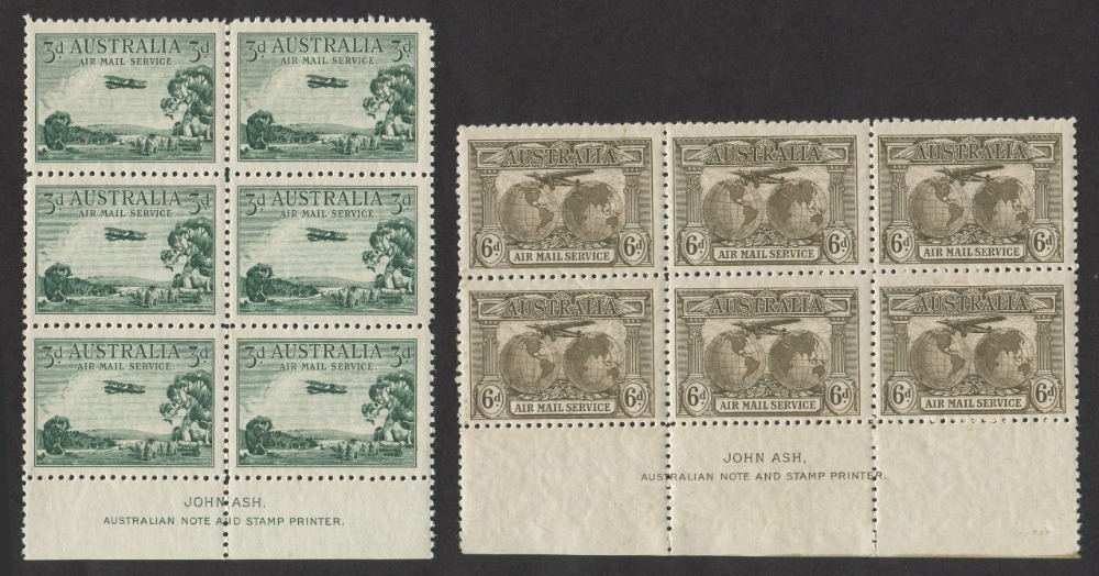 1929 (SG.115) 3d green Airmail, Ash Imprint blk.6 MUH; plus 1931 (SG.139) 6d sepia Airmail, Ash Imprint blk.6, MUH/MLH and very well centred. (12). BW: Cat.$585.