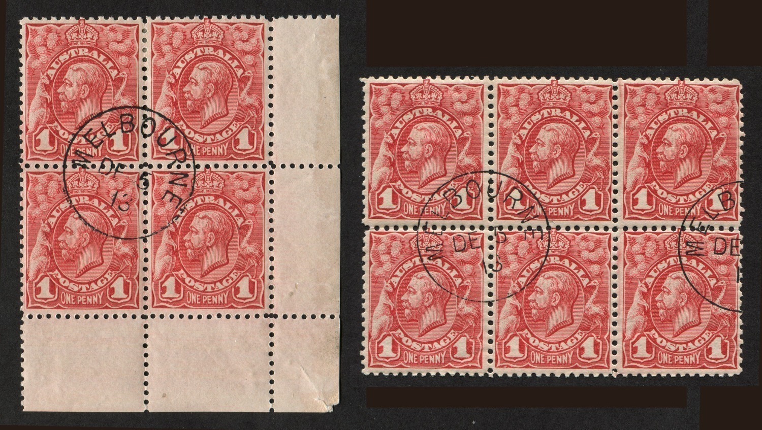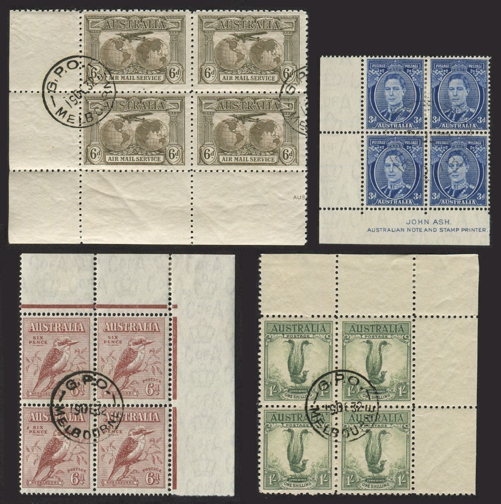 A group of CTO corner blks.4 with full gum: 1931 sepia Airmail 1932 6d Kookaburra, and 1932 1/- Lyrebird, all CTO MELBOURNE 19 DE 32; also, 3d blue KGVI (Die 3) Ash Imp.blk.4 CTO. (16).