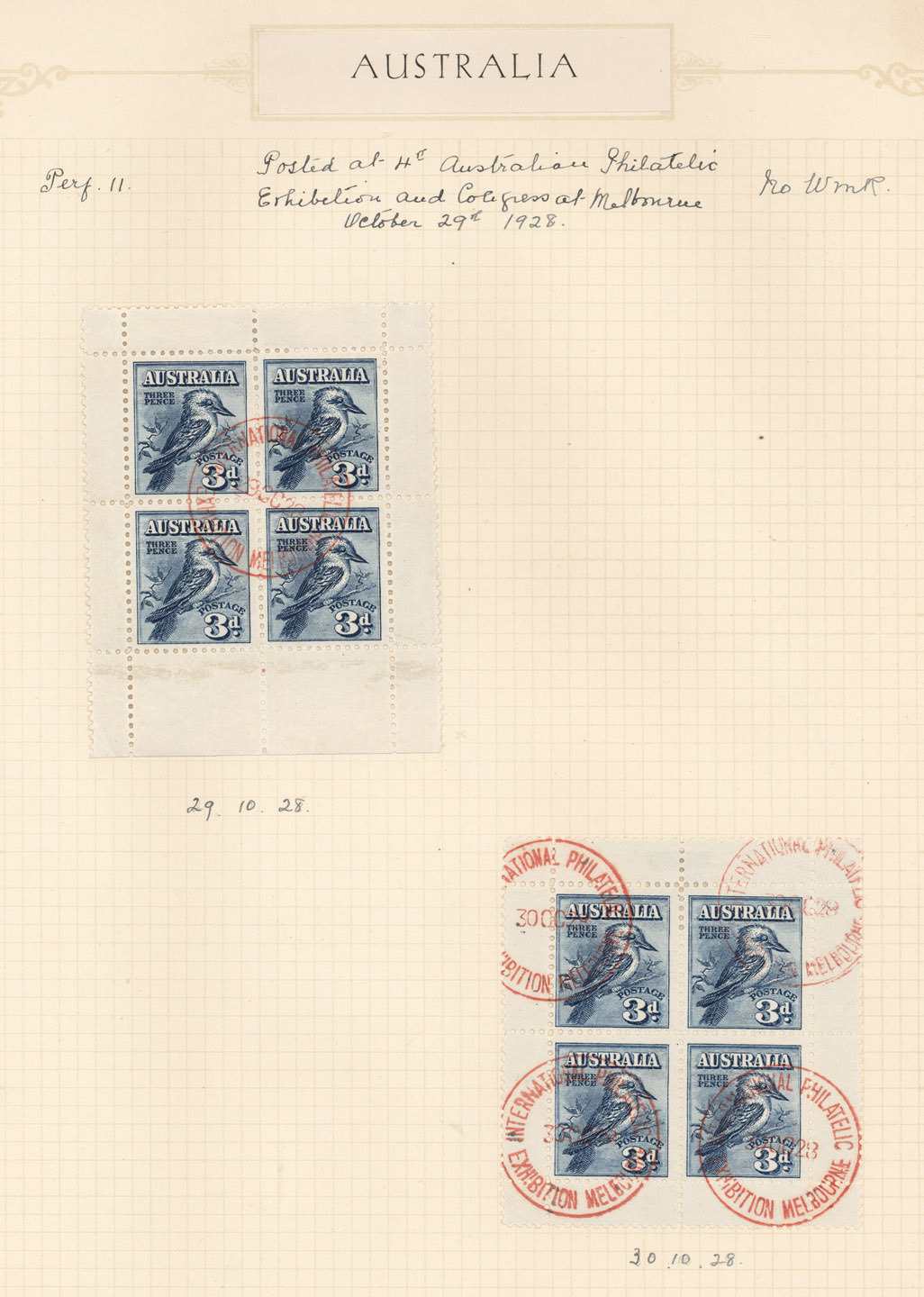 1928 3d Kookaburra Miniature Sheets cancelled-to-order at the Melbourne Philatelic Exhibition: 29th October (red), 30th October (red), 31st October (blue), 1st November (red), an attractive group. (4 M/Sheets).