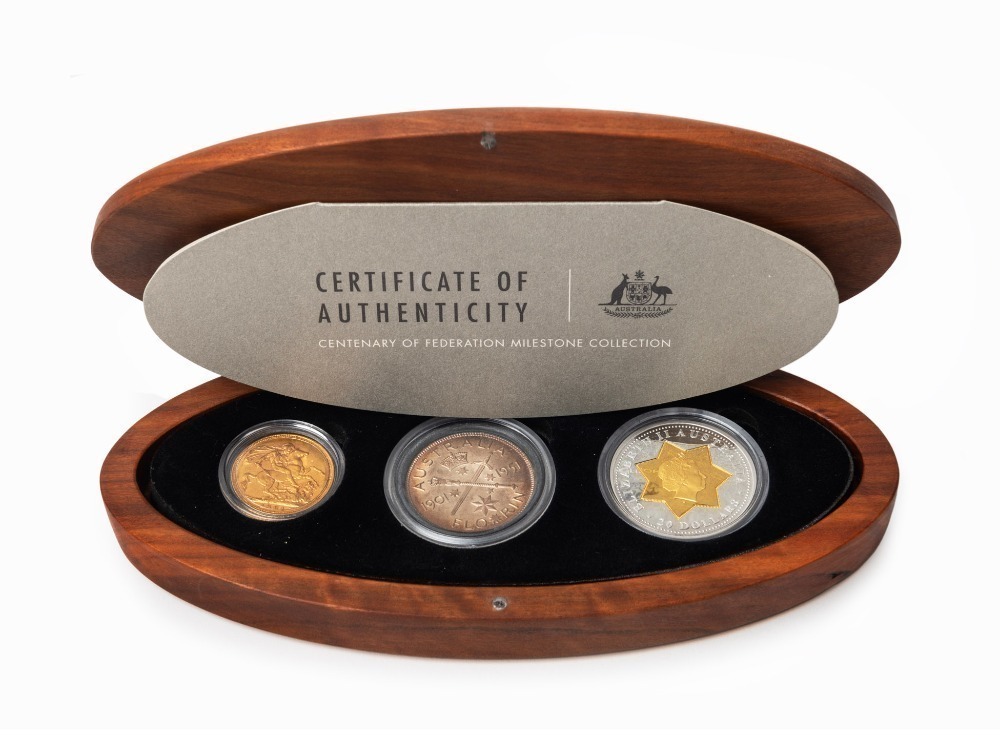 The CENTENARY OF AUSTRALIA MILESTONE COLLECTION: 2001 three coin collection presented in a custom-made oval timber case, comprising of an uncirculated 1901M Sovereign, an uncirculated 1951 50th Anniversary