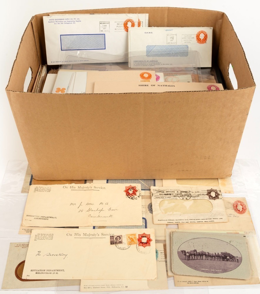 Envelopes, Wrappers, and even a Myer 5/10 Parcel label (faults). A wonderful source of material for the collector or reseller. (many 100s of items).