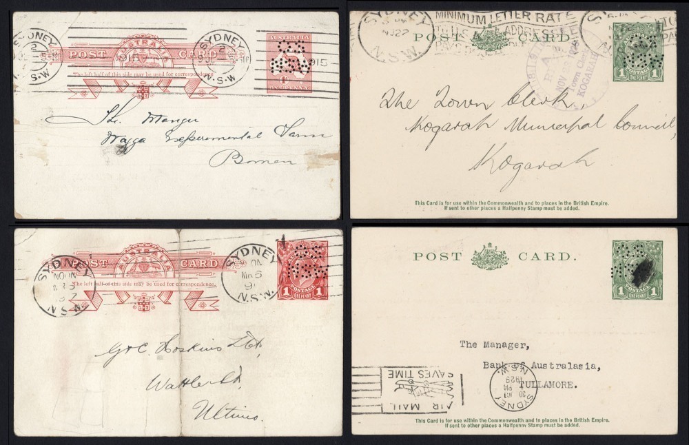 POSTAL CARDS PUNCTURED OS/NSW: 1913 1d Kangaroo (P24eb), 1915 1d red KGV (P27ed) and 1924 1d green Die 2 KGV (P62e x 2); all used, but condition is mixed. Cat.$1000.