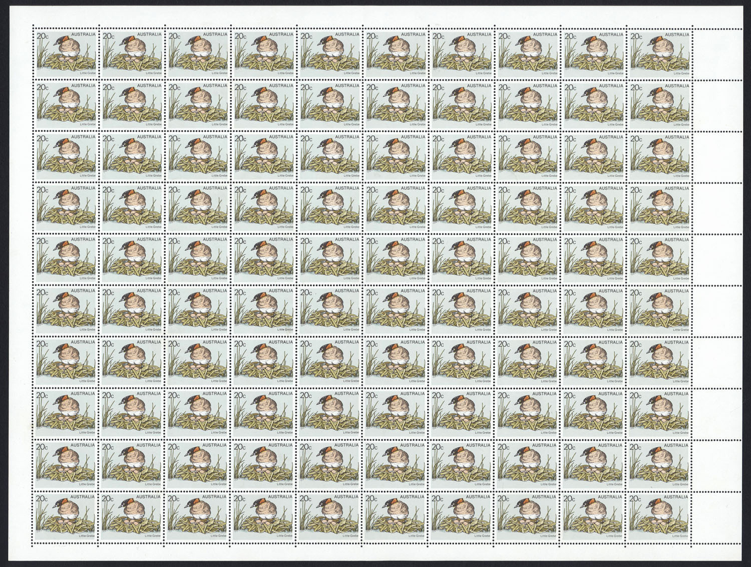 1978-80 (BW:805ch) 20c Little Grebe complete sheet of 100 with variety "Yellow misplaced", resulting in the beak and eye being devoid of colour, fine MUH. CW: $20,000.