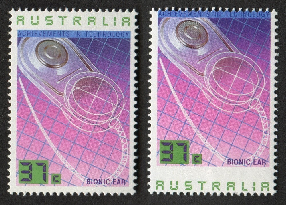1987 Technology 37c Bionic Ear, variety 'AUSTRALIA' at base rather than top due to misplaced perforations', BW 1224b; with normal stamp for comparison, (2). MUH.