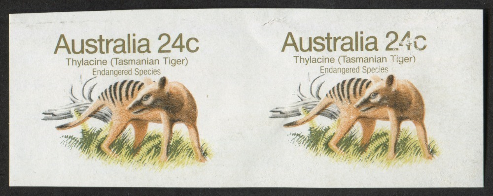 1981 24c Thylacine (Tasmanian Tiger), completely imperforate horizontal pair, (2), MUH. SG.788a; BW:902b.