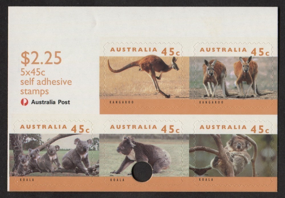 1994-97 (SG.1459b variety) 45c Kangaroos and Koalas sheetlet of 5 units with punch-hole incorrectly placed at bottom of sheetlet. BW:1752b. MUH.