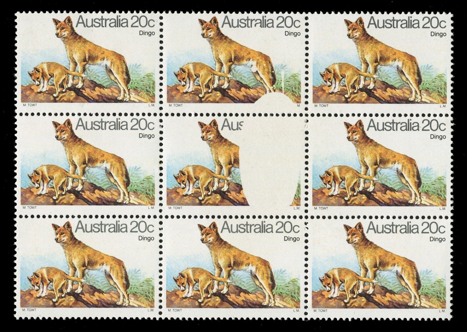 1980 (SG.729) 20c Dingo, blk.(9), two units with striking oval-shaped flaw resulting in a significant portion of the design and "stralia 20c Dingo" being completely absent from one unit and a smaller