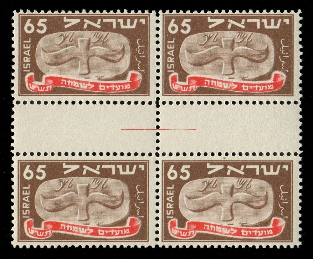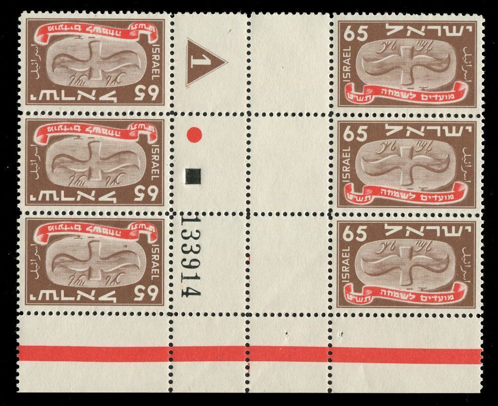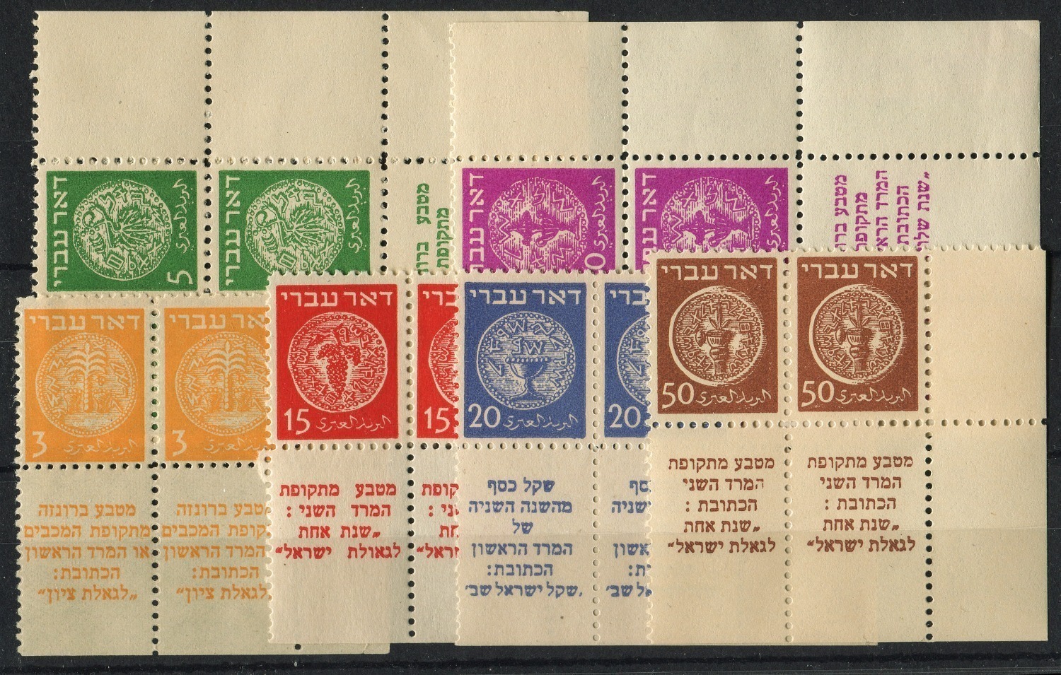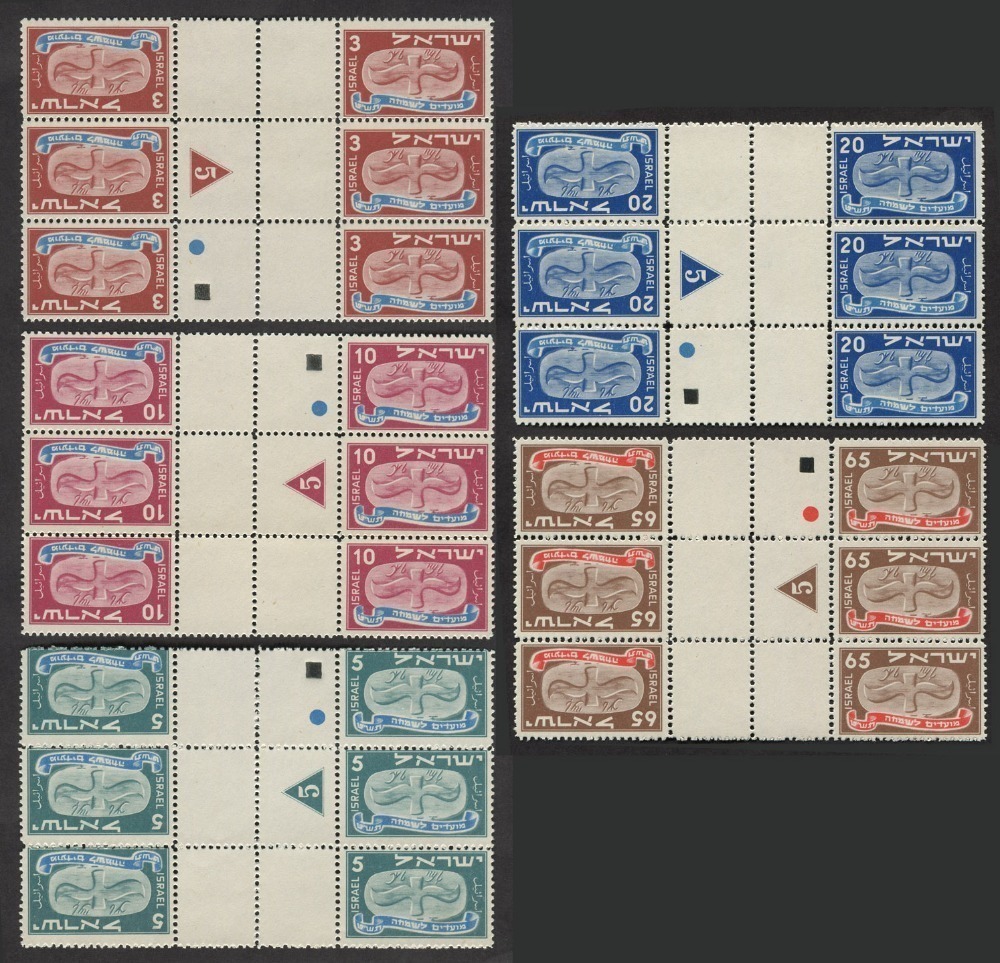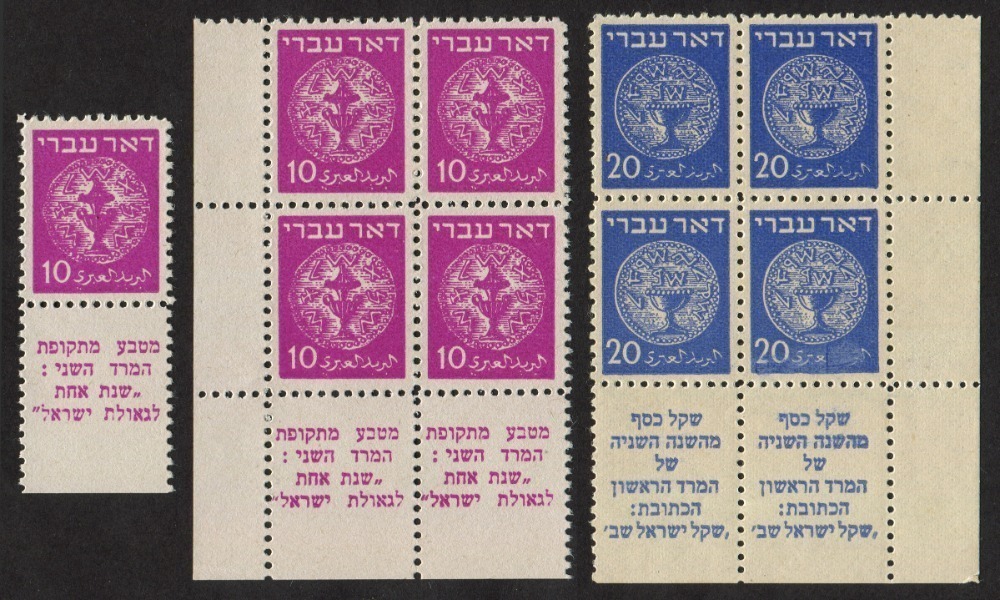 1948 (Bale 3b, 5) 10m Doar Ivri tab block of 4, plus tab single, all with wrong tabs, together with tab block of 4 of the 20m, one unit with printing flaw affecting the arabic text, and appearing as a