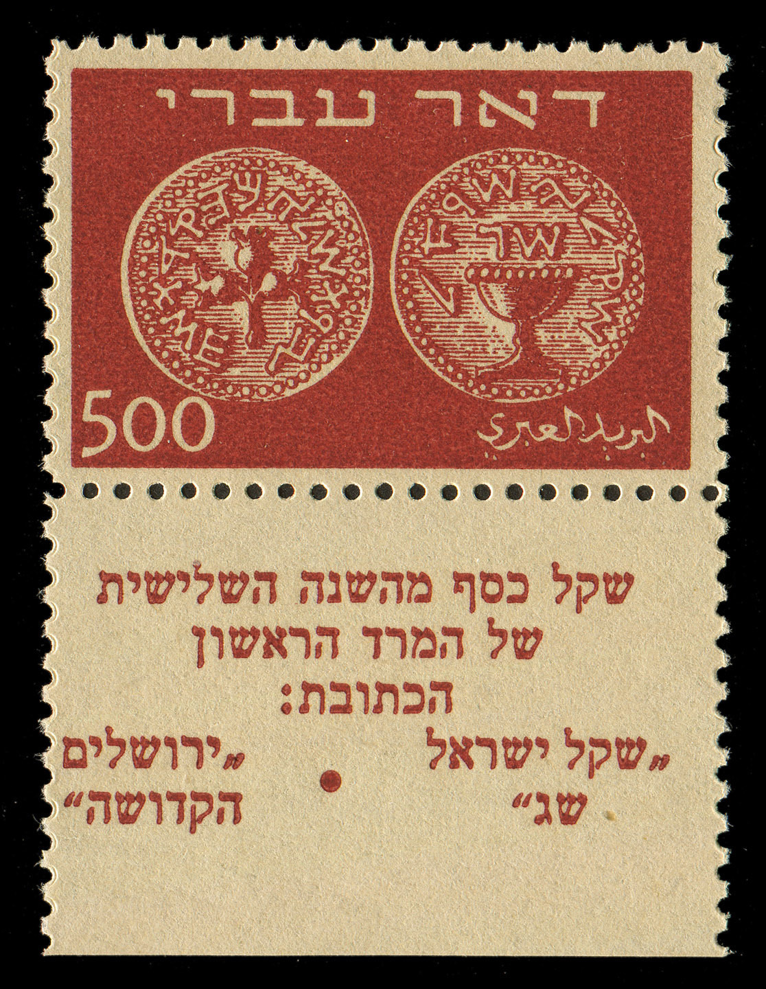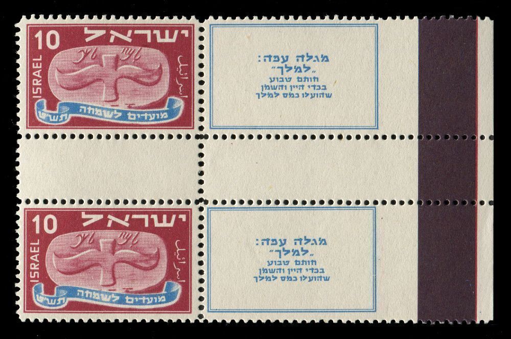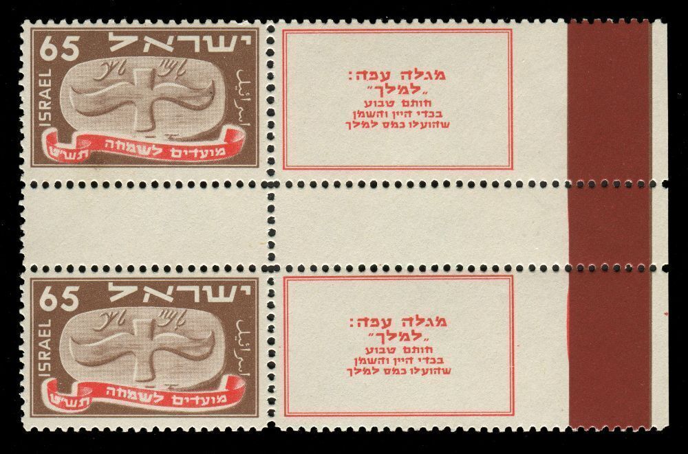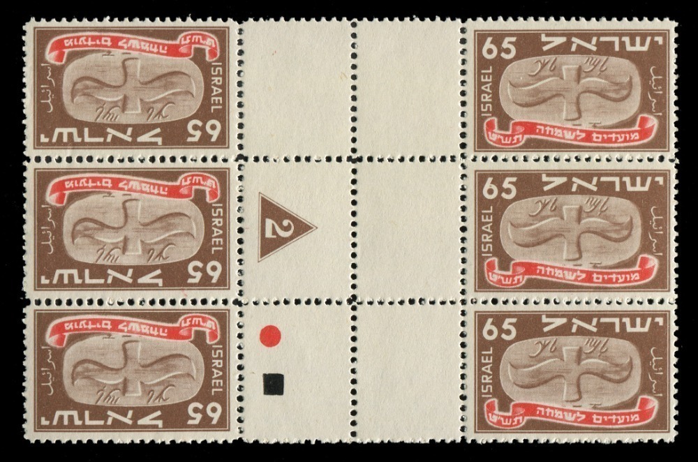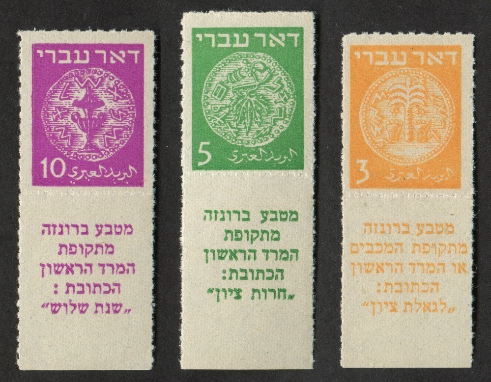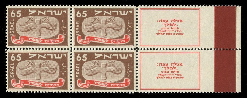 1948 (Bale 3b, 5) 10m Doar Ivri tab block of 4, plus tab single, all with wrong tabs, together with tab block of 4 of the 20m, one unit with printing flaw affecting the arabic text, and appearing as a
