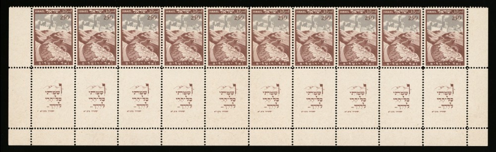 1949 (Bale 15) 250pr Road to Jerusalem, complete tab strip of (10) from the base of a sheet; superb HUH condition.