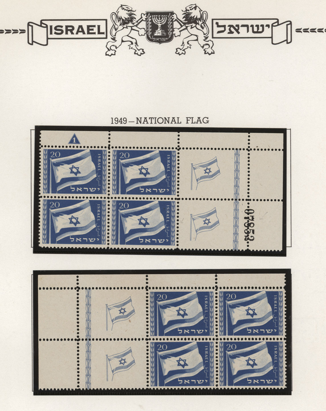 1949 (Bale 16, 16a) National Flag 1st Independence Day, right tab plate block together with a left tab block, superb MUH. (8)