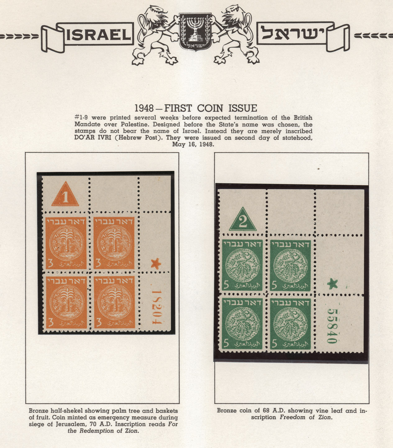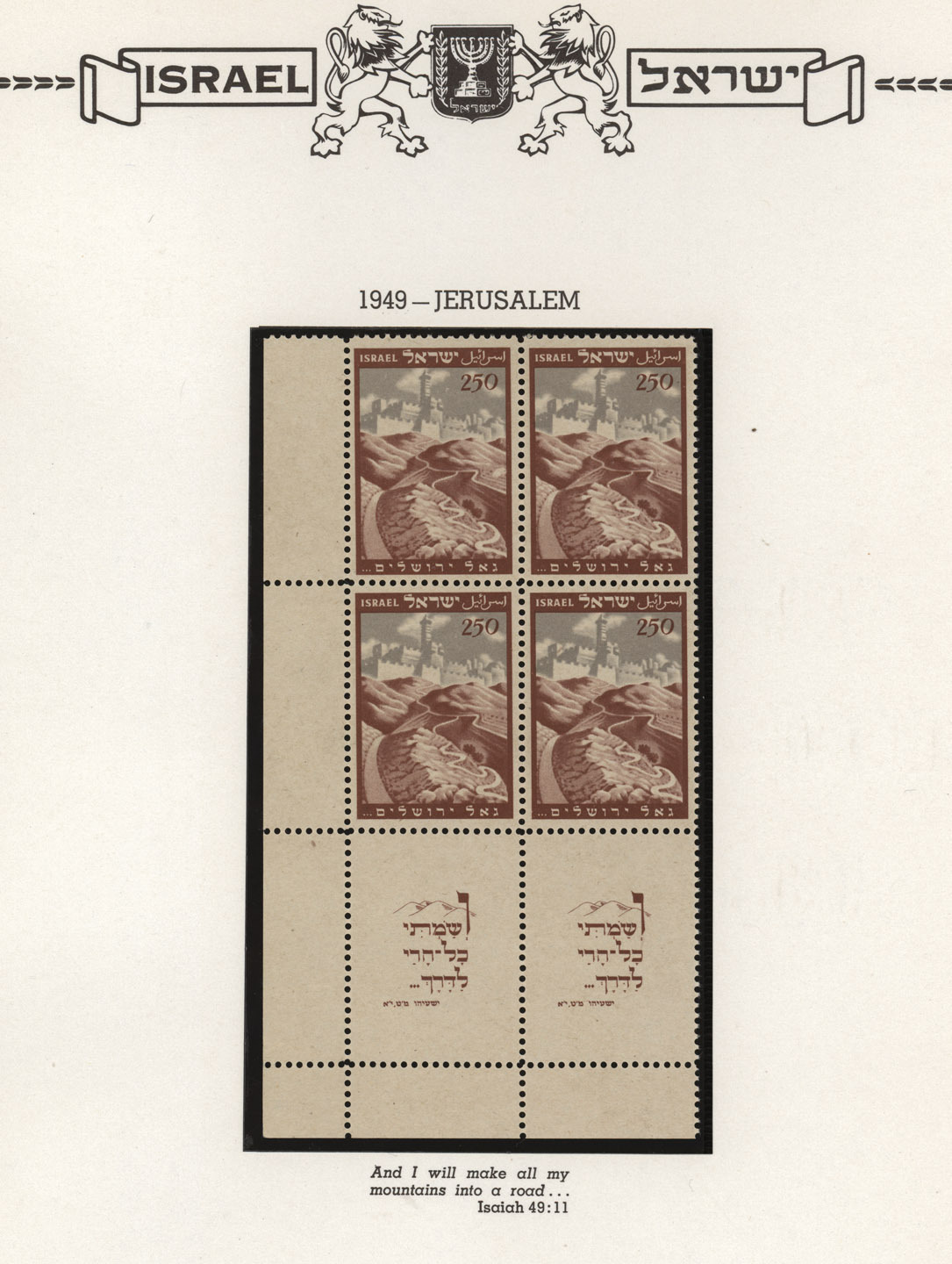 1949-1950 (Bale 15, 27-28, 31) 250pr Road to Jerusalem, 40 and 80pr UPU pair, and 100pr Hebrew University, all in superb MUH corner tab blocks of 4. (16)