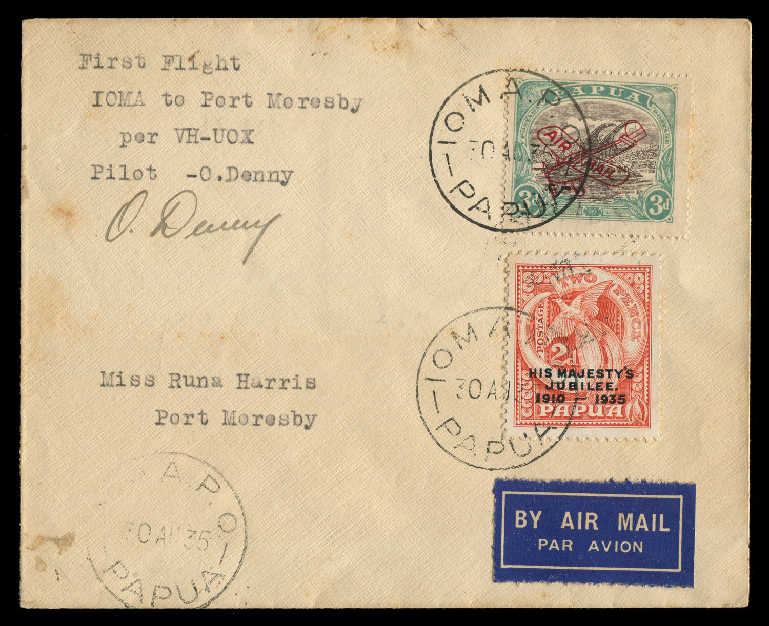 30 Aug.1935 (AAMC.87) Ioma - Port Moresby first flight cover signed by pilot Orme Denny [54 flown]. Cat.$225.