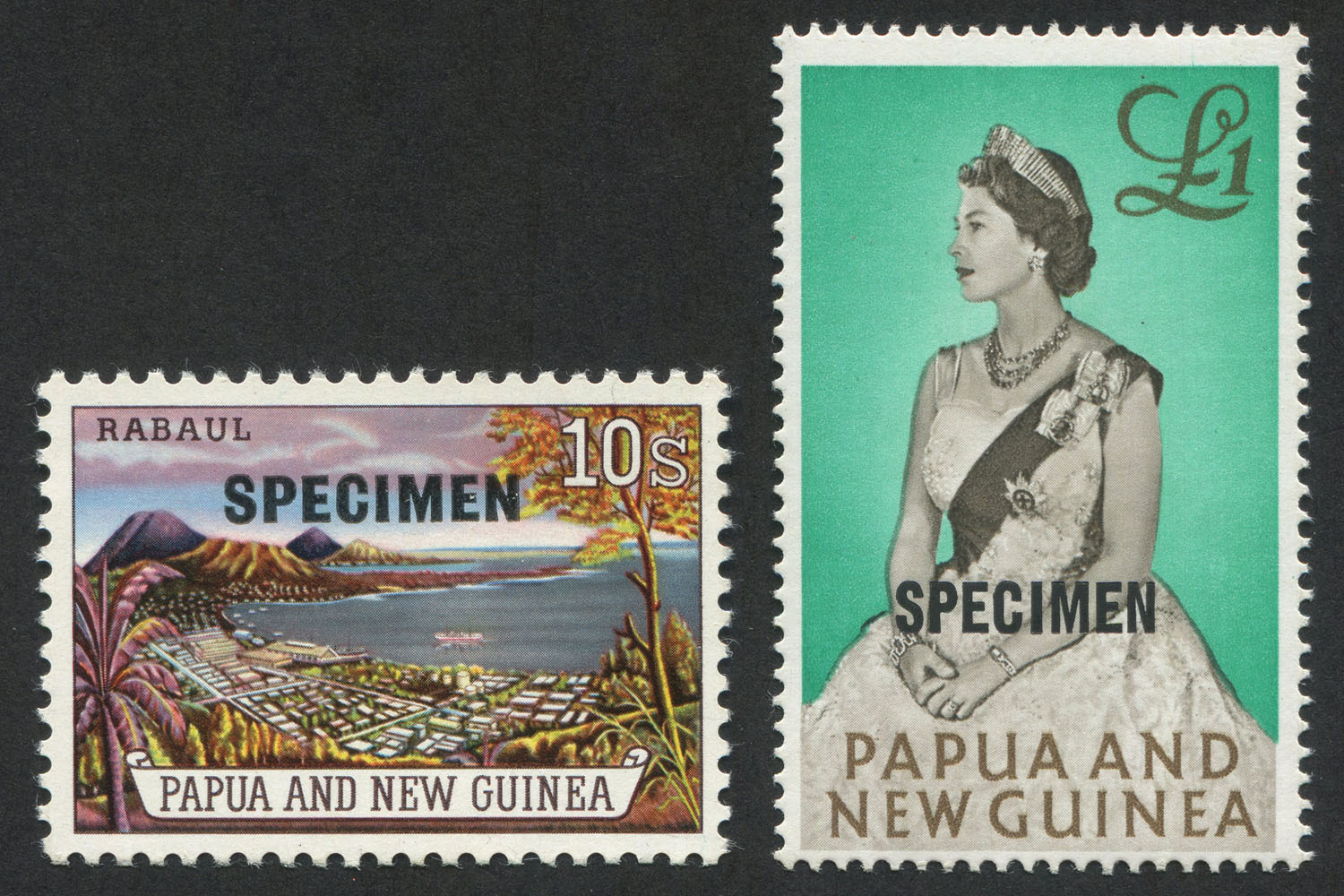 1963 (SG.44s & 45s) 10/- Rabaul & £1 Queen overprinted SPECIMEN (2); the 10/- very lightly mounted, the £1 MUH.