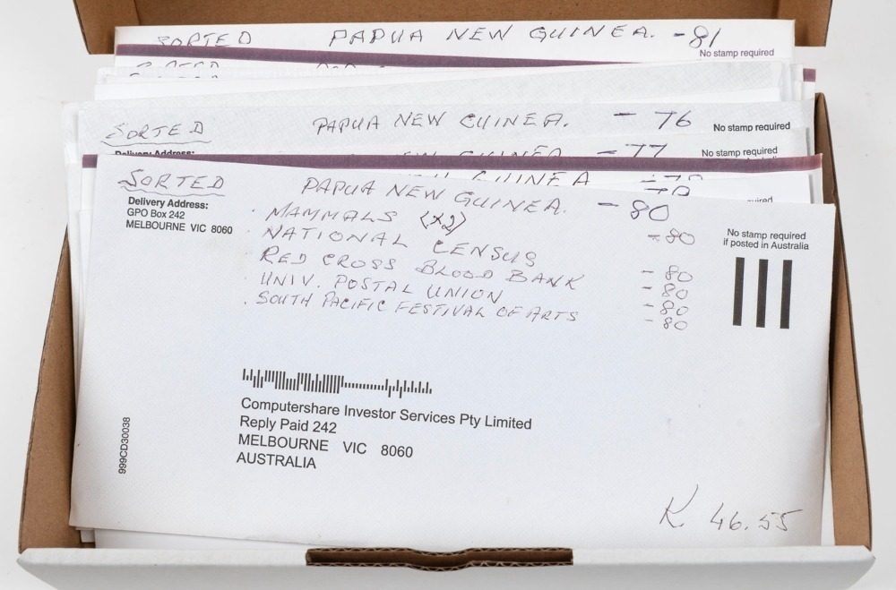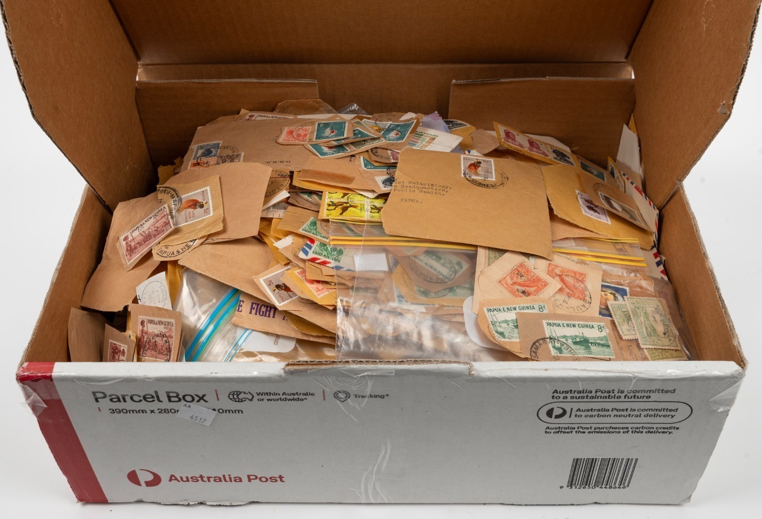 A carton containing PNG pre-decimal commercial covers, and numerous stamps cut from envelopes, mostly preserving the postmark; noted values to 10/-. (qty).