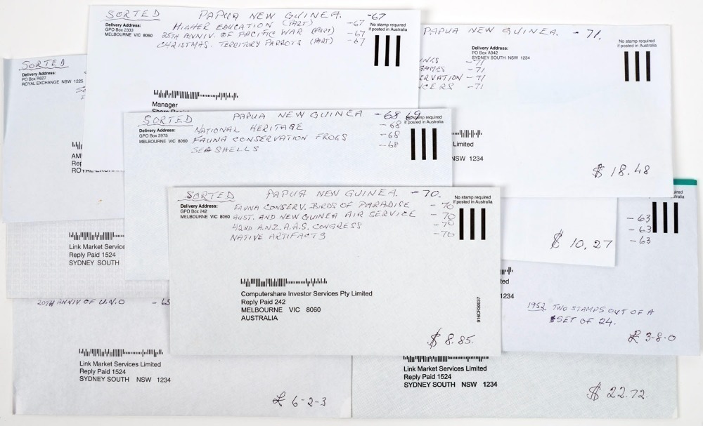 An interesting range of covers including pre-decimal FDCs to £1 Fisherman, 1/7 Cattle, Birds to 10/- (x5), 10/- Rabaul (x2), Canoe Prows (x12), etc., plus a small range of early decimal FDCs. Also,